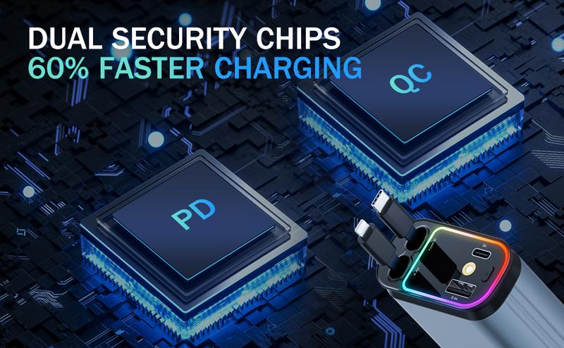 - [ Upgraded Car Charger ]:Car Charger with Starry Sky. The 4 in 1 car charger equippes with a real PD 66W Type-C retractable cable (fast charging port), and IOS retractable cable, and additional USB-C and USB-A ports, this charger offers fast charging for up to four devices simultaneously.